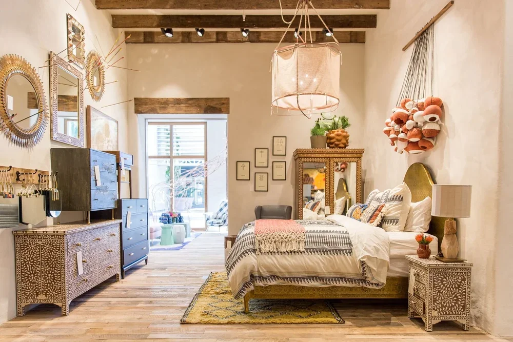 Relaxed and eclectic, the bohemian style celebrates global influences and layered textures. It combines earthy tones with vibrant pops of colour, incorporating tribal patterns and natural materials like wicker and rattan.